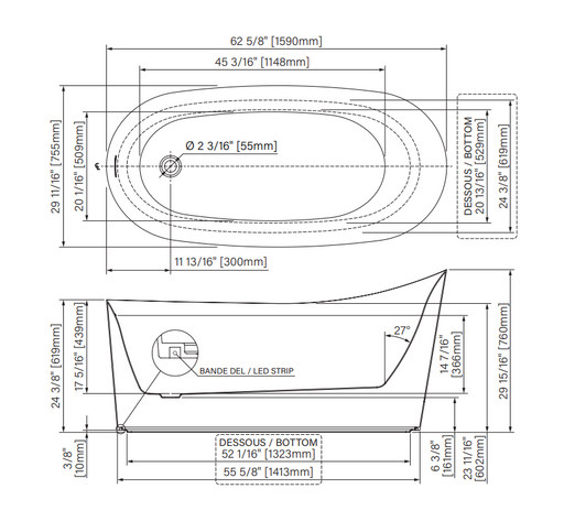 ZittaBaignoire Ano blanc Dimensions: 62 5/8" x 29 11/16" x 29 15/16" Fait en acrylique blanc mat Bande DEL intégrée Drain inclus Pattes ajustables Tro...
