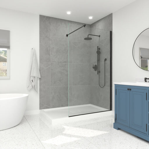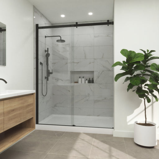 Duo Base de douche 2 côtés, drain décentré, 60" X 32" + Ensemble de porte de douche au choix Noir mat