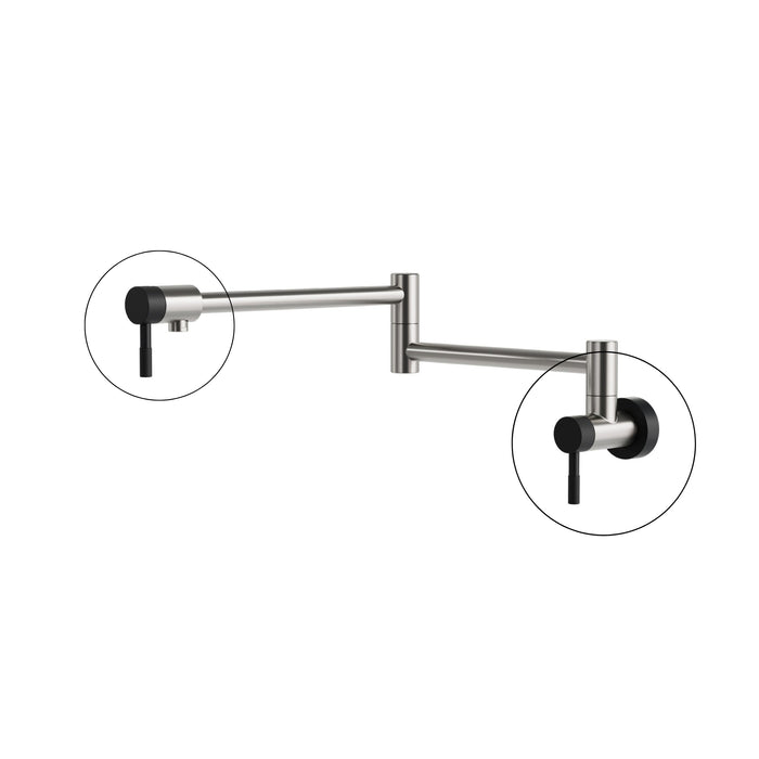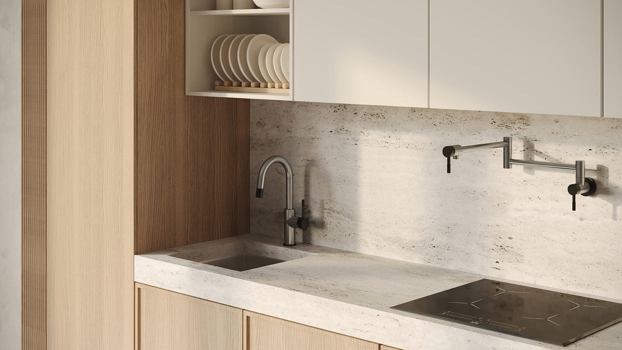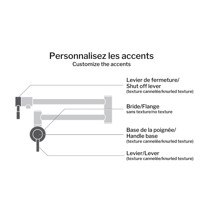 Optimisez votre cuisine avec le robinet remplisseur mural de la Collection UMIX. Conçu pour offrir praticité et style, ce robinet est parfait pour remplir vos casseroles directement sur la cuisinière tout en optimisant l’espace sur le plan de travail. Avec ses 5 finitions élégantes et 2 jeux d’accents de couleur inclus, il vous permet de personnaliser son apparence pour qu’il s’harmonise parfaitement avec votre décor.