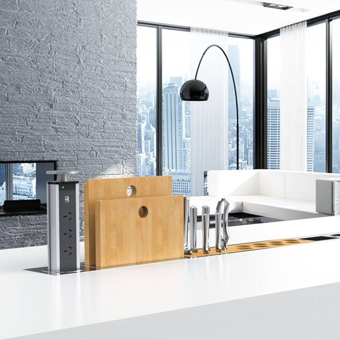 RETRACTABLE POWER BAR - 3 OUTLET, 2 USB