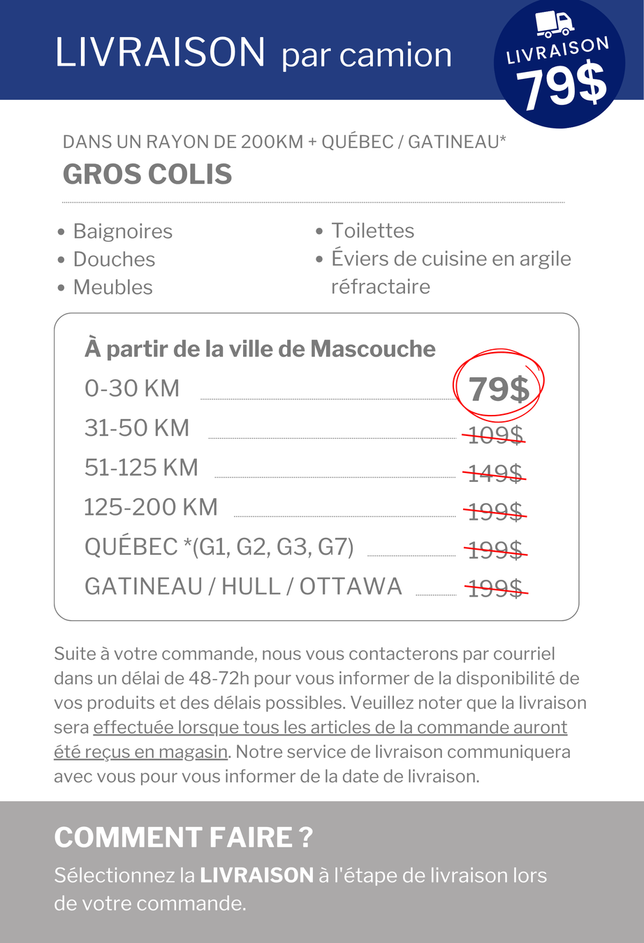 La livraison est limitée à un rayon de 200 km de notre succursale de Mascouche, ainsi qu'à la ville de Québec et Gatineau.