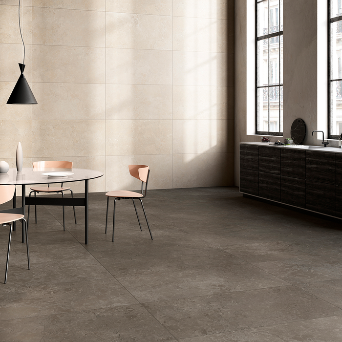 La collection Lagos allie minimalisme et authenticité, s'inspirant de la pierre calcaire avec une fabrication écoresponsable et résistante au gel. Ses nuances de gris terre et ses veinures texturées créent un intérieur harmonieux.